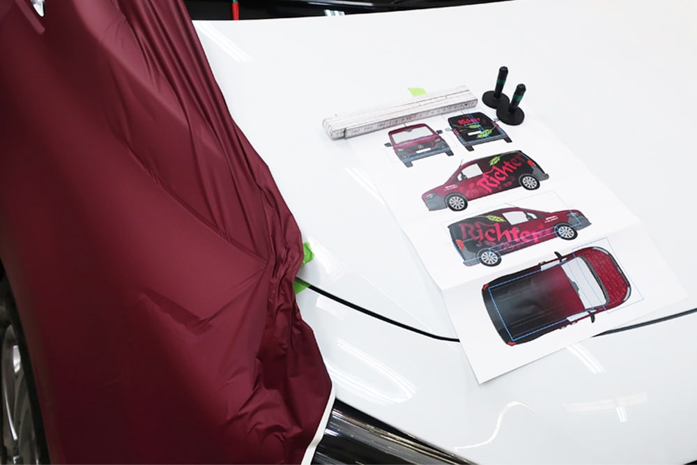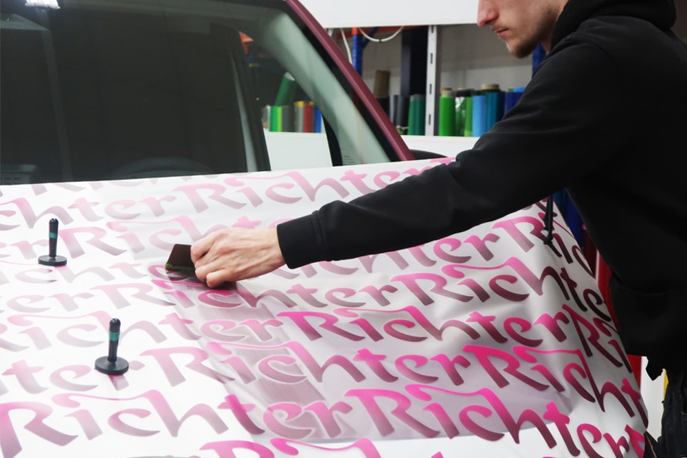 Der Umfang der Beklebung umfasst vier Seiten sowie das Dach. Die Umsetzung erfolgte 4/0-farbig im Digitaldruck und wurde mit einem UV-Schutzlaminat in matter Ausführung veredelt, das sowohl für erhöhte Langlebigkeit als auch für eine edle Optik sorgt.
