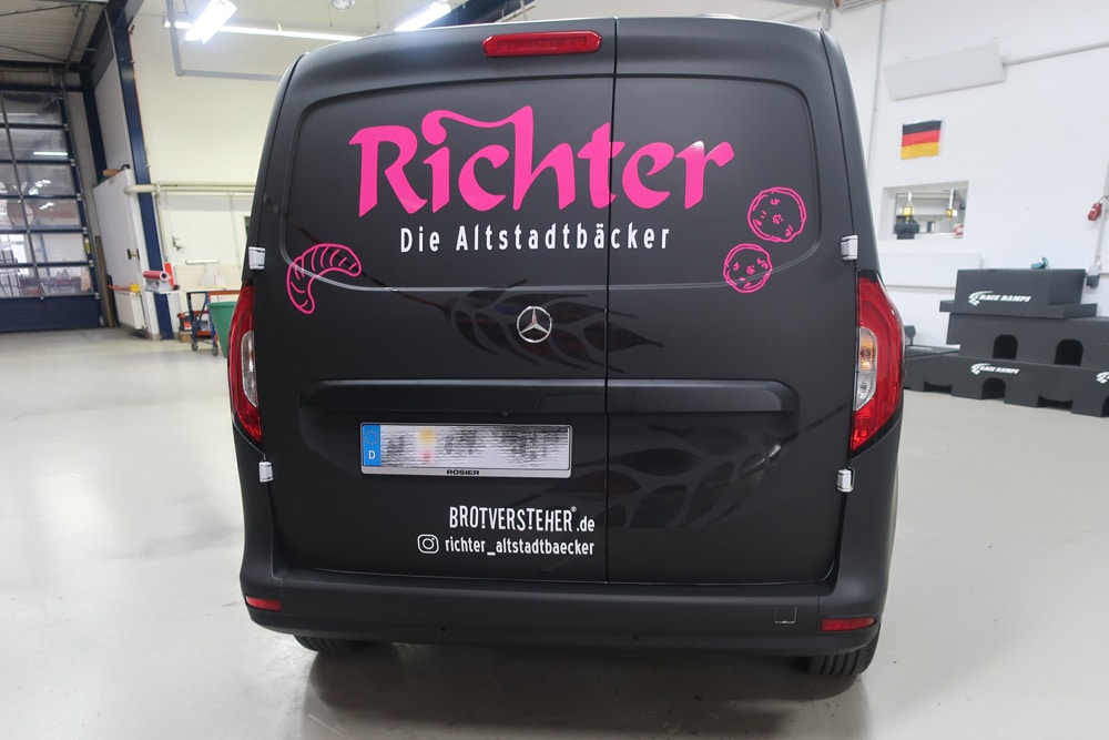 Für den Mercedes eCitan der Altstadtbäckerei Richter wurde ein modernes und hochwertiges Fahrzeugdesign mit einer außergewöhnlichen Folienzusammenstellung realisiert. In enger Zusammenarbeit des Kunden mit einer Agentur sowie unserem Werbetechnikwissen entstand ein durchdachtes und überzeugendes Folienkonzept.