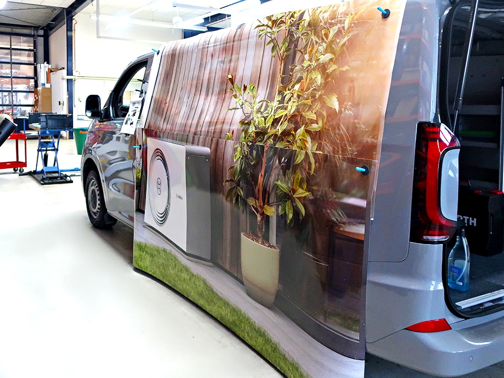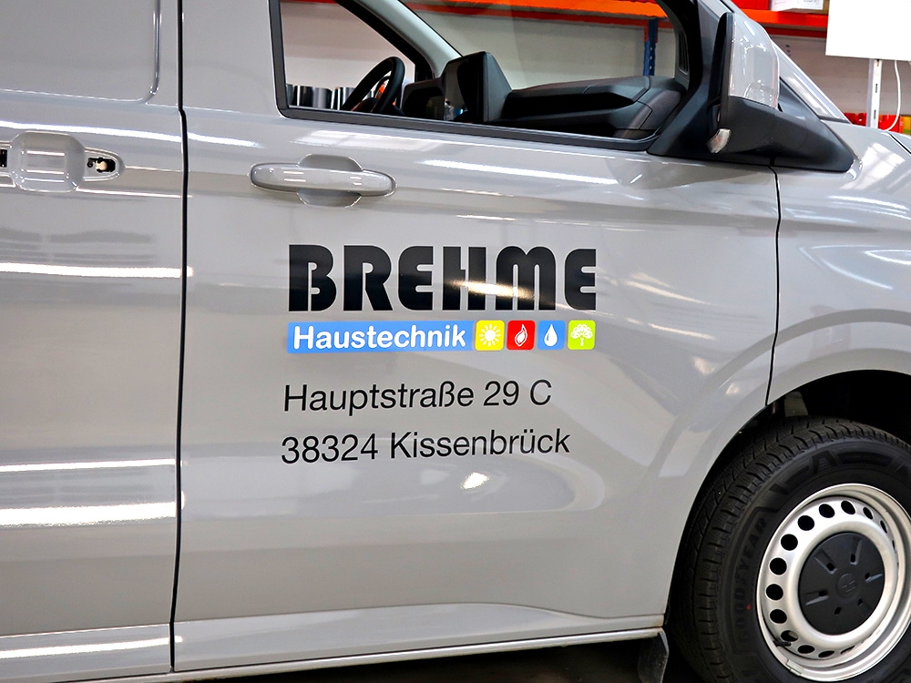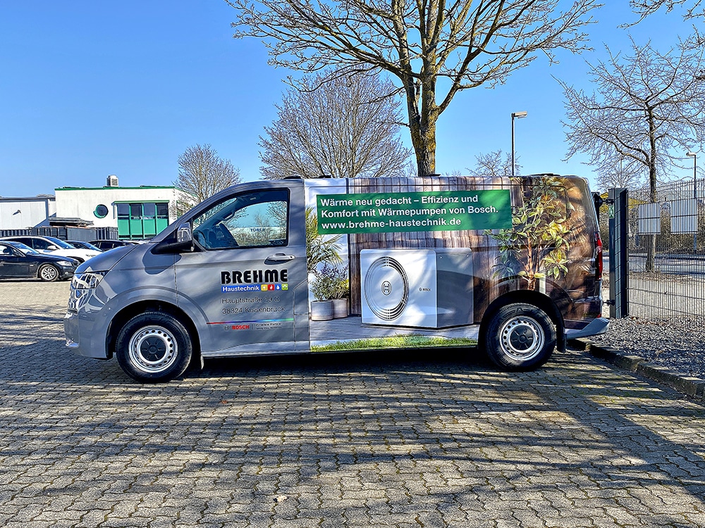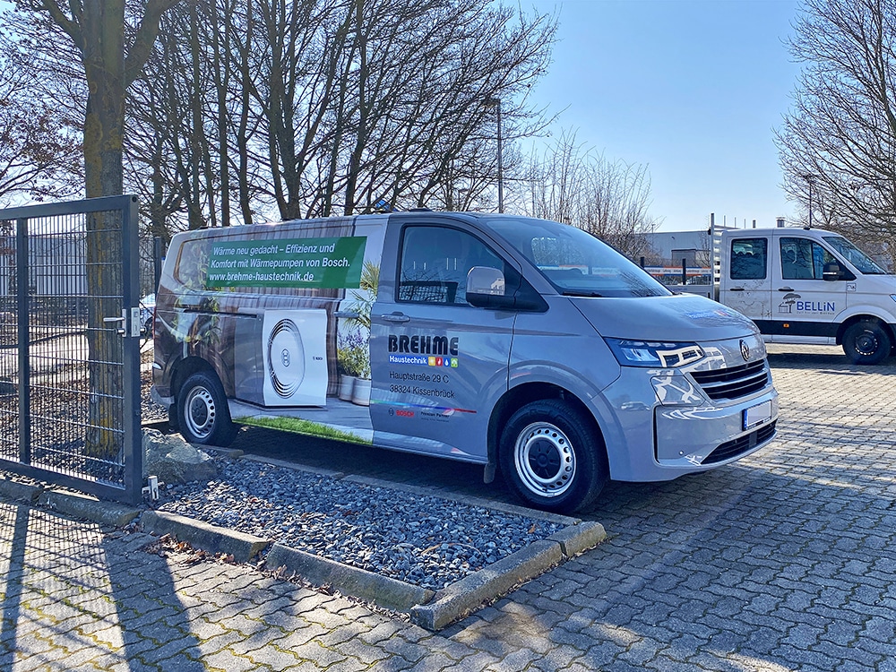 Für die Firma Brehme Haustechnik wurde ein VW T7 gemäß individueller Kundenvorgabe im Bosch Motiv beschriftet. Die Gestaltung erstreckt sich über die Motorhaube, die Seitenflächen sowie das Heck und sorgt für einen einheitlichen, aufmerksamkeitsstarken Markenauftritt im Straßenverkehr.