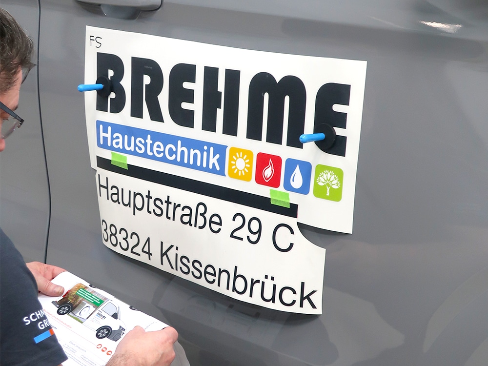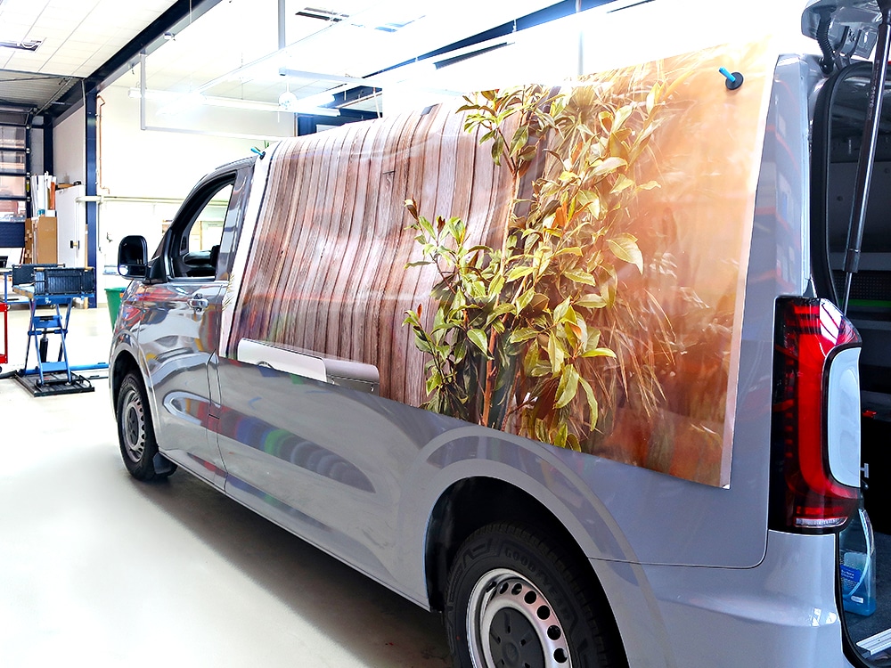 Die Umsetzung kombiniert präzisen einfarbigen Folienschnitt aus Hochleistungsfolie mit 4/0 farbigem Digitaldruck. Letzterer wird durch ein glänzendes Schutzlaminat veredelt, das nicht nur für brillante Farben sorgt, sondern auch einen langfristigen UV-Schutz gegenüber Witterungseinflüssen und Kratzschutz gewährleistet. So entsteht eine langlebige, hochwertige Fahrzeugbeschriftung mit professioneller Wirkung.
